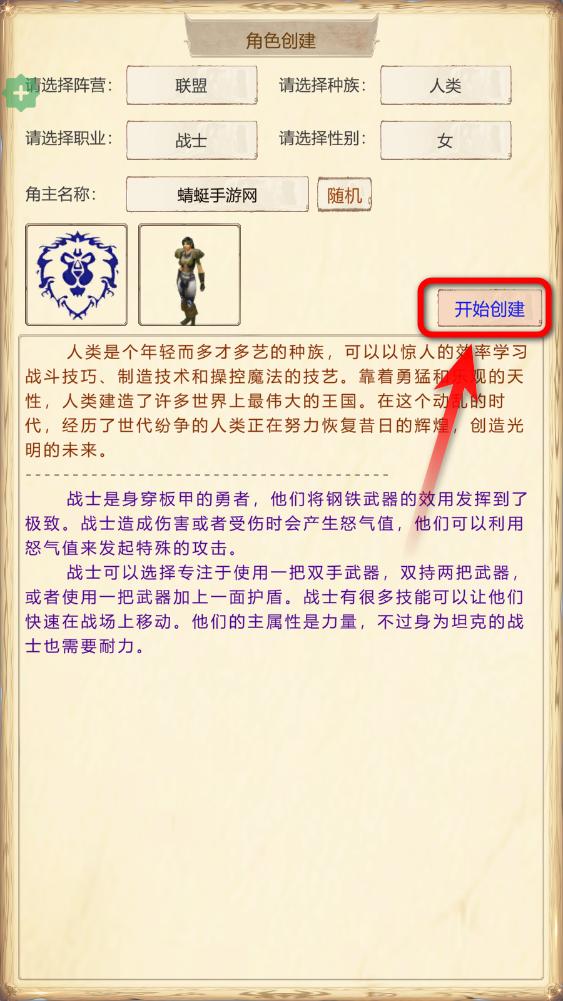 2.为你的角色选择他的职业、性别、种族(前期只有这几个可以选择),取一个名字,就可以创建角色了。
