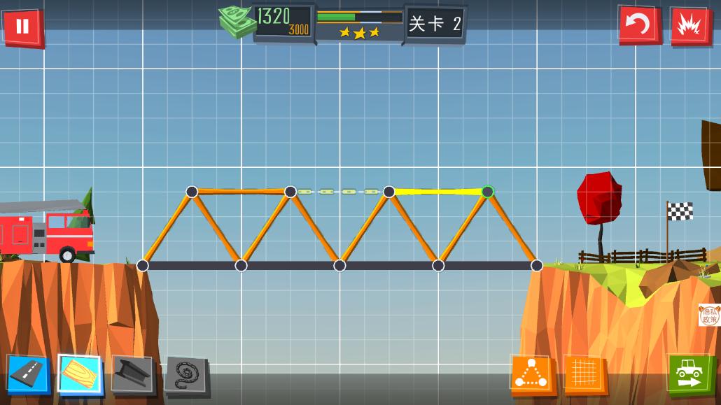 桥梁缔造者是一款融合了建筑设计与物理挑战的创新建造游戏,你将扮演一名桥梁设计师,利用多种材料和创意,为不同地形和环境中的车辆、行人甚至船只搭建稳固的桥梁。你需要合理选择桥梁的设计,考虑材料的强度、预算的限制以及环境的适应性。随着任务的逐步推进,难度会逐渐增加,新的材料和结构形式也会逐步解锁,挑战不断升级。