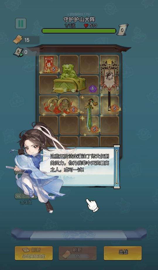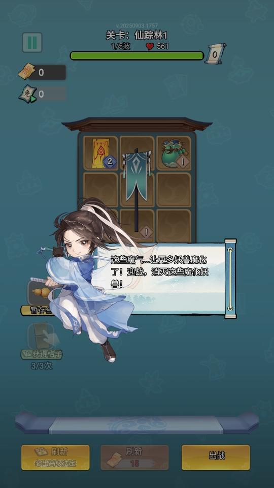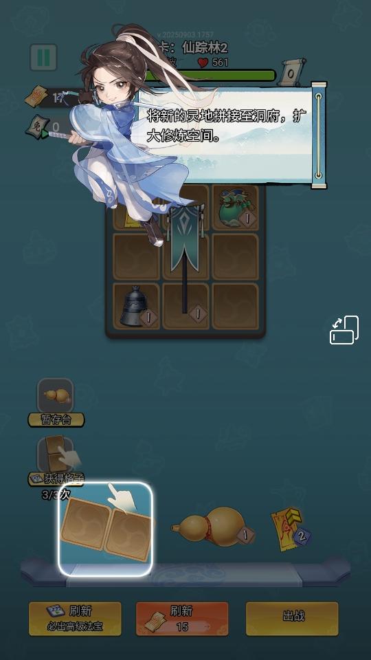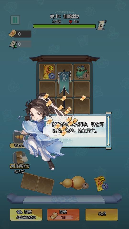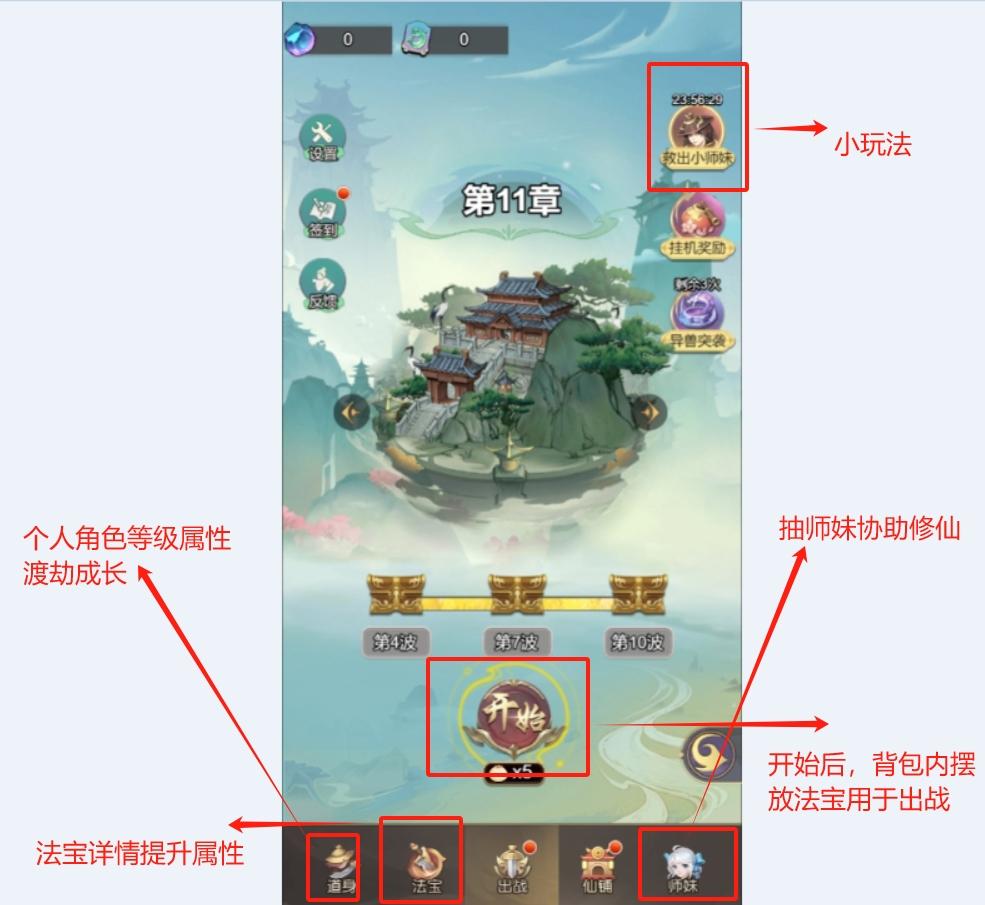 摆放法宝后,进行打怪。获得资源奖励。提升道身等级属性。可抽取师妹,协助作战;