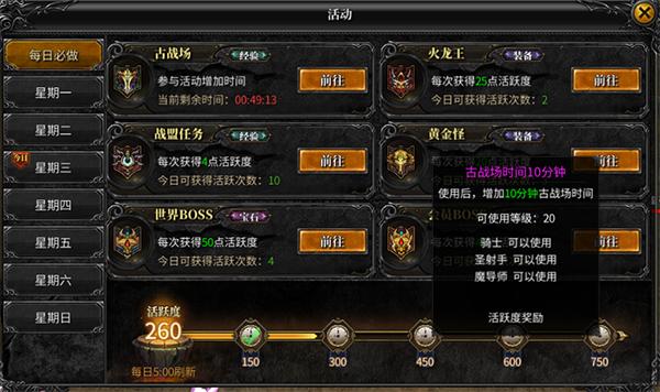 进入古战场需要消耗古战场时间,古战场内装备和爆率都比野外地图高。进去后开始打怪就会消耗时间,时间为零会自动退出古战场。点击前往按钮可以直接传送去怪物所在地。因为古战场时间有限,推荐配合加经验获取效率的道具使用——光之祝福,小熊猫等。