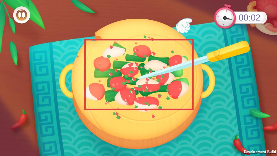 3.跟随指引,用刀具处理锅中食材,完成菜品制作。