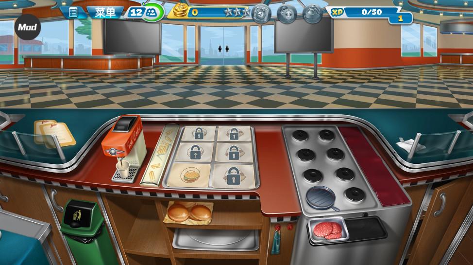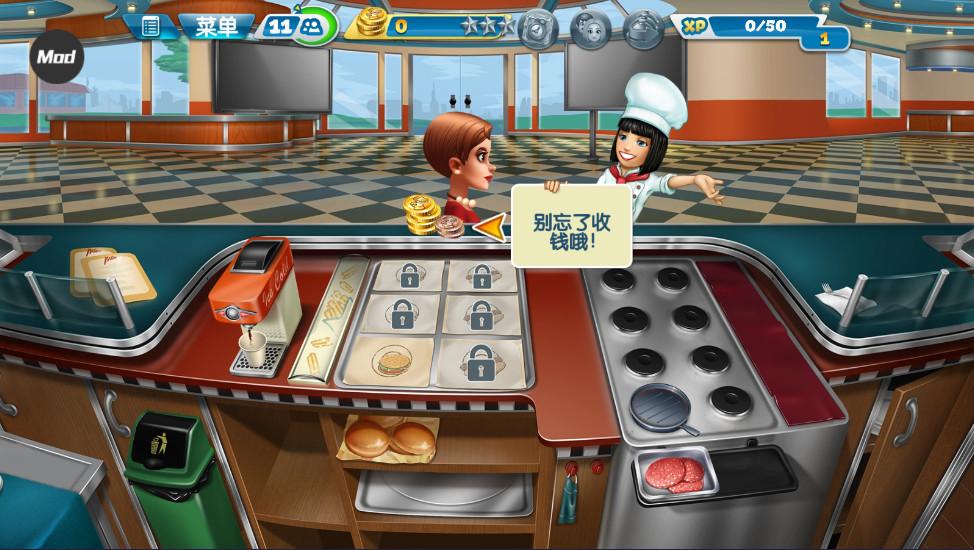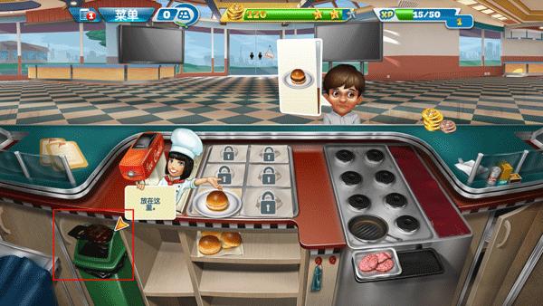 1、打开游戏,进入关卡1。根据客人的口味,选择汉堡包,然后将牛排放入到汉堡包里面,最后将食物递给顾客。顾客吃到自己想要的食物,就会给与金币和小费在桌子上,你需要点击桌子上的货币来获取。