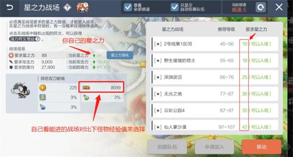 5、星力战场是我们最主要的升级系统,根据自身装备的星力数量总和解锁相对应星力的地图,星力越高,进入对应的星力地图经验也越高;