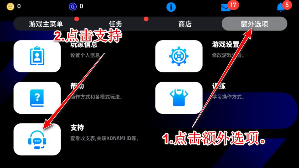 11.注册完之后从本页面下载实况足球国际服,安装进入游戏首页点击额外选项,然后点击支持。