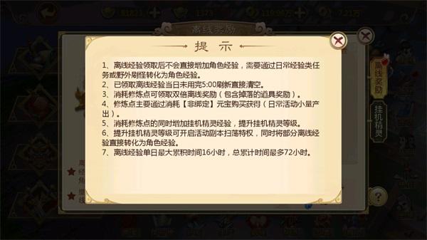 除了角色可以获取经验之外,挂机精灵的经验也会增长。当挂机精灵升级时,玩家可以获取更多“扫荡特权”,可以使用扫荡券扫荡之前无法扫荡的试炼副本。也会在之后的离线挂机中获得更高的铜钱、掉落和经验加成!