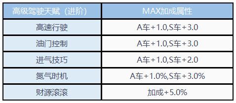 该阶段为进阶版的高级驾驶天赋,除了需要高级驾照以外还要角色的等级达到40级才能解锁该天赋,高级驾驶天赋(进阶)可以解锁高速行驶、油门控制、进气技巧、氮气时机和财源滚滚,该阶段的天赋适用于A车和S车,不提供其他级别车的天赋加成,重点加成了S车的天赋,除了财源滚滚外,其他天赋对S车的加成都非常高,大大提升了S车的性能。