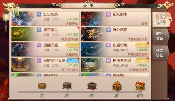 当收益最高的主线做完之后,参与天书活动也是必不可少的升级方法。天书活动这么多如果想要快速升级当然还是需要有选择性的做。天书活动中追捕邪魔获得的经验最为丰厚,其次是红尘历练,最后血魔幻境、保护苦行头陀、副本任务、帮会开树等活动还可以获取少量的经验。