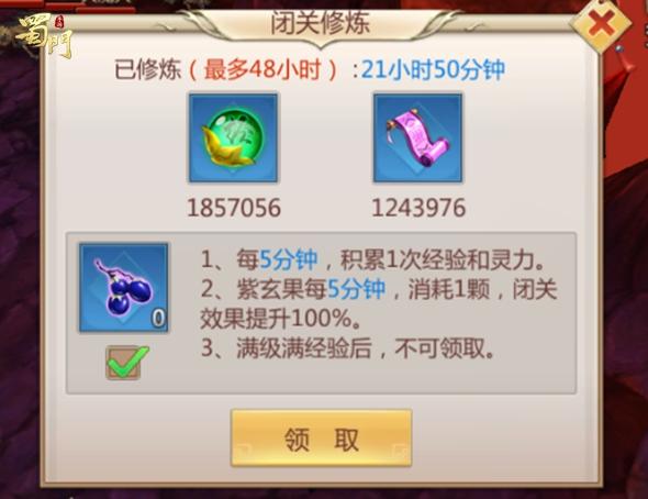 当你所有任务都已经完成,双倍挂机也用完的时候,不如放下手机,稍作休息。再上线的时候,就有海量的经验等你领取!离线经验最多累计48小时,还可以使用紫玄果获取双倍离线经验!不过比起上面参与主线与天书活动获取的经验,离线经验相对还是比较少的。
