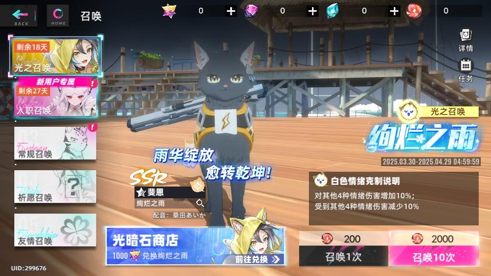 根据测试的内容来看,公测时猫之城会存在三种抽取武装的池子,分别是:新角色限时UP池,定期轮换的常驻双UP池,以及没有任何UP的常驻池。这三种池子都使用同一种道具“绪晶”进行抽取,三个池子所需道具数量也是一样的,单次500,十连5000,对应是需要180和1800猫眼石。