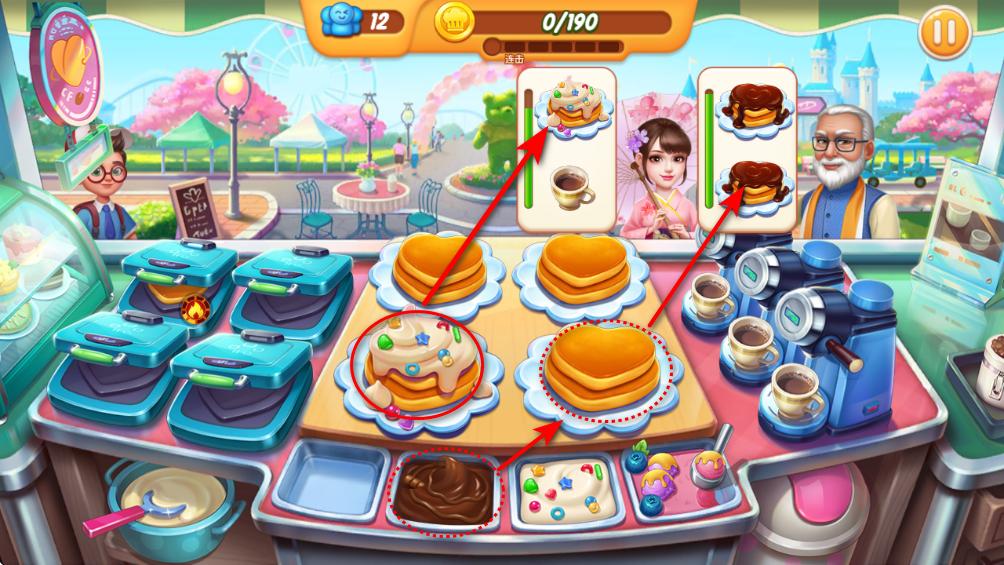 玩法攻略相对来说是比较简单的,第1步我们按照提示点击松饼面糊,这样就能够将饼摊在烤炉之上。当松饼烤好之后,可以点击在烤炉上的松饼,然后放在盘中。可根据每个顾客所需的口味抹上不同的果酱,如果喜欢巧克力的话,可以抹上巧克力酱。