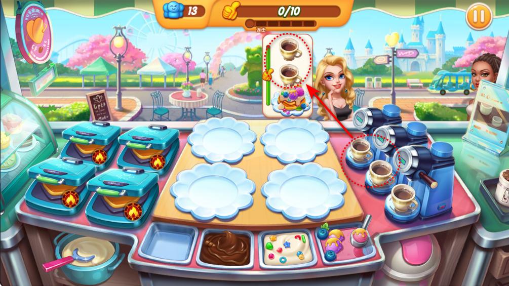 将松饼制作完成之后,将制作好的食物递给顾客,有的顾客还会有其他需求,都会直接展现在屏幕上,比如想要喝咖啡玩家,点击对应的食物即可快速制作。顾客收到实物会支付一定的金币,获得足够的金币就能够成功通关。