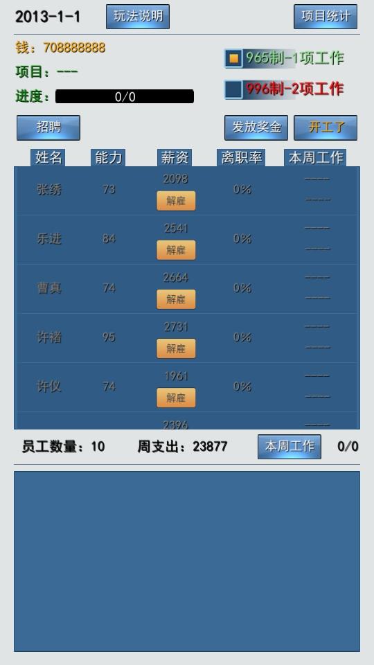 注意:开工前需要选择工作制度,这里有965-1项工作和996-2项工作,其中996很容易带来负面影响,员工容易辞职。