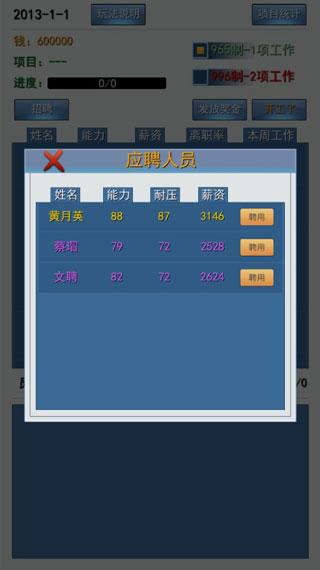 3、完成制作后会给与你,可观察左上方的项目进度,合理的进行员工招募和奖金分配来缓和员工情绪,降低离职率。
