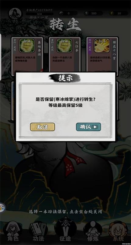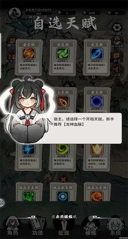 有了这6个技能就可以去打怪了,每打完一场就抽天赋和技能。每次打不过怪了,就先抽技能再打,打不过点一下修炼。每次打不过就是这样重复。换一下技能的上场,抽技能升级,最后迫不得已才是点修练点。