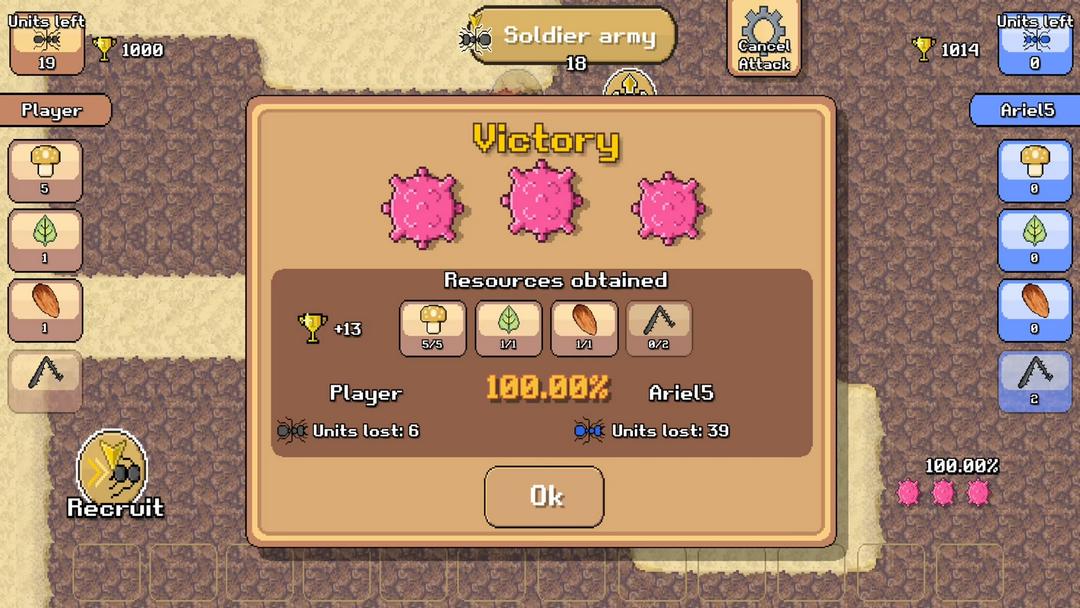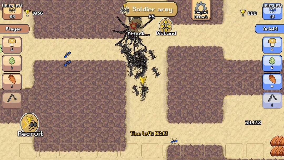8.移动控制其他的蚂蚁去攻击其他的动物,需点击下方的battle,这里还可以查看血量。