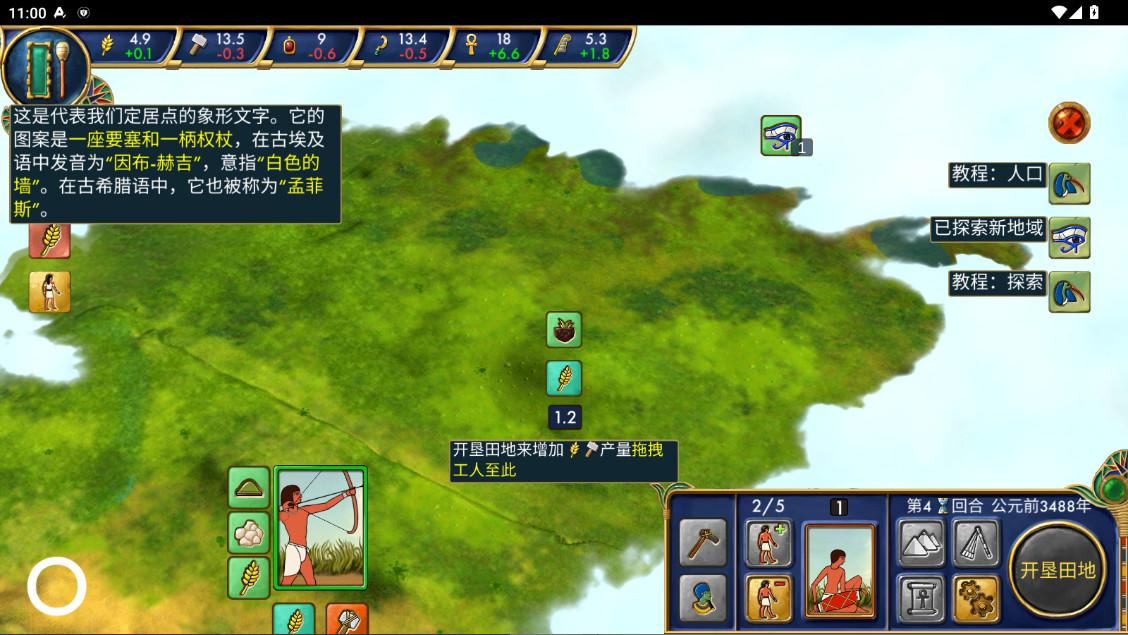 由于出了一个+3文化事件,同时算上新出的工人提供的文化,我们可以提前一个回合开科技,所以楼主直接让新出的第5个工人进行了建筑工作,我们村落的第一块粮田就建成了。这个时候我们分析一下局势,即使我们出了房子科技,并花三个回合建筑,但是我们需要4个回合才能出下一个工人,同时没有非常好的资源产地供工人工作。也并没有探索出亚麻田建筑的位置,所以楼主决定先出上路,也就是权威的科技。