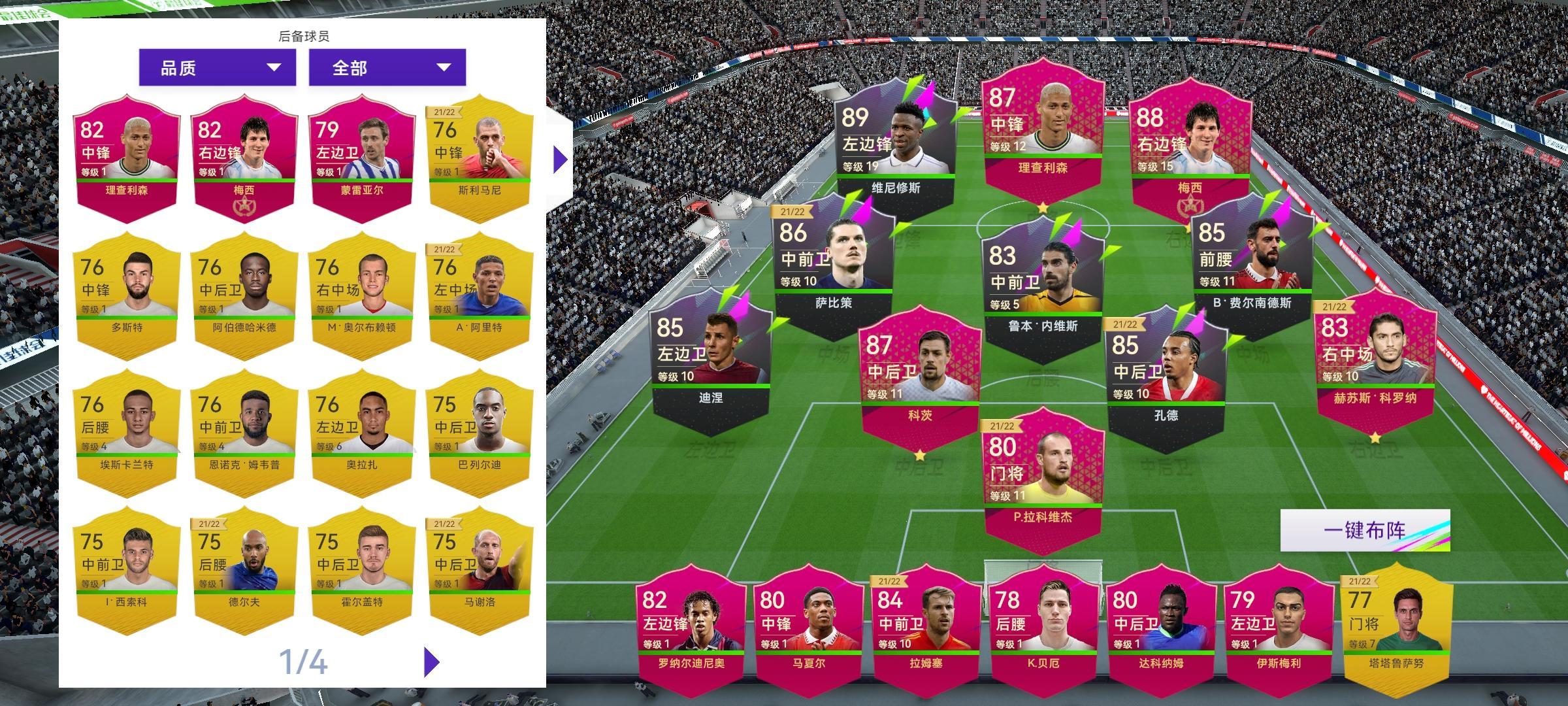 当然对于终究阵容的选择也可以根据这个思路来,可以直接根据游戏内的评分来进行,就拿目前游戏里综合评分最高的是93分的梅西、然后就是91分的C·罗纳尔多、91分的内马尔、91分的德布劳内、91分的萨拉赫、91分的姆巴佩、91分的本泽马。这个几个球员都是综合评分比较高的也是非常推荐大家去获取的强力球员。