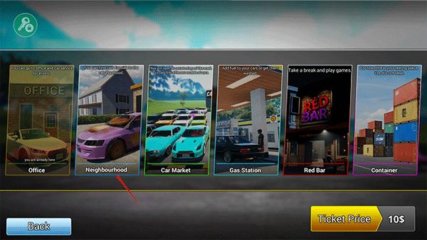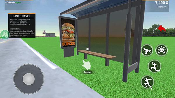 7.通过公交站我们可以前往办公室、邻里、汽车超市、加油站、红酒吧、容器6个地方,由于本次我们是要去购买二手车,所以我们需要前往邻里购买汽车。