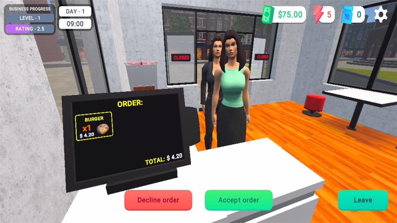 我的汉堡店模拟器是一款轻松有趣的模拟经营手游。在游戏中,你将化身汉堡店老板,亲手从制作汉堡、炸薯条,到为顾客点餐、收银,体验经营店铺的每一个环节。你可以解锁新菜单、升级厨房设备、装饰你的店铺,以吸引更多顾客。游戏以其简单上手的玩法、丰富的菜单选择和充满成就感的经营体验为特色,旨在让你感受打造属於自己汉堡店的乐趣。