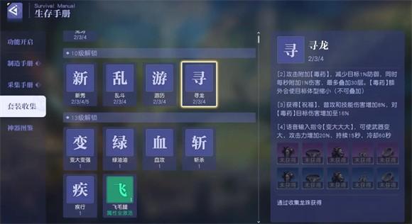 2、第一天推荐收集【寻龙套】,通过完成龙珠支线获得,而龙珠可以通过在地图中探索获得;寻龙套可以提供稳定的增伤,让自己变大敌人变小,墙裂推荐!除此之外,还有一些其他的小套装也推荐大家收集,例如乱斗套、绿油油套等,推荐大家在生存手册中进行查看,寻找自己心仪的装备。