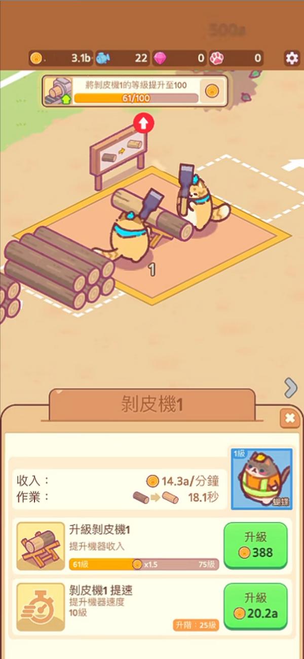 1.开始点击屏幕,帮助您的猫咪砍伐树木并收集原木。你点击的越多,它们的速度就越快。