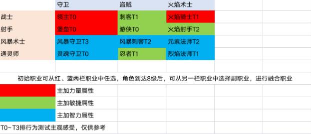 T0代表当前最强一档,上限高;T0.5代表强势职业,可以很好提升游戏体验;T1代表中规中矩的职业;T2代表后期比较废的职业。