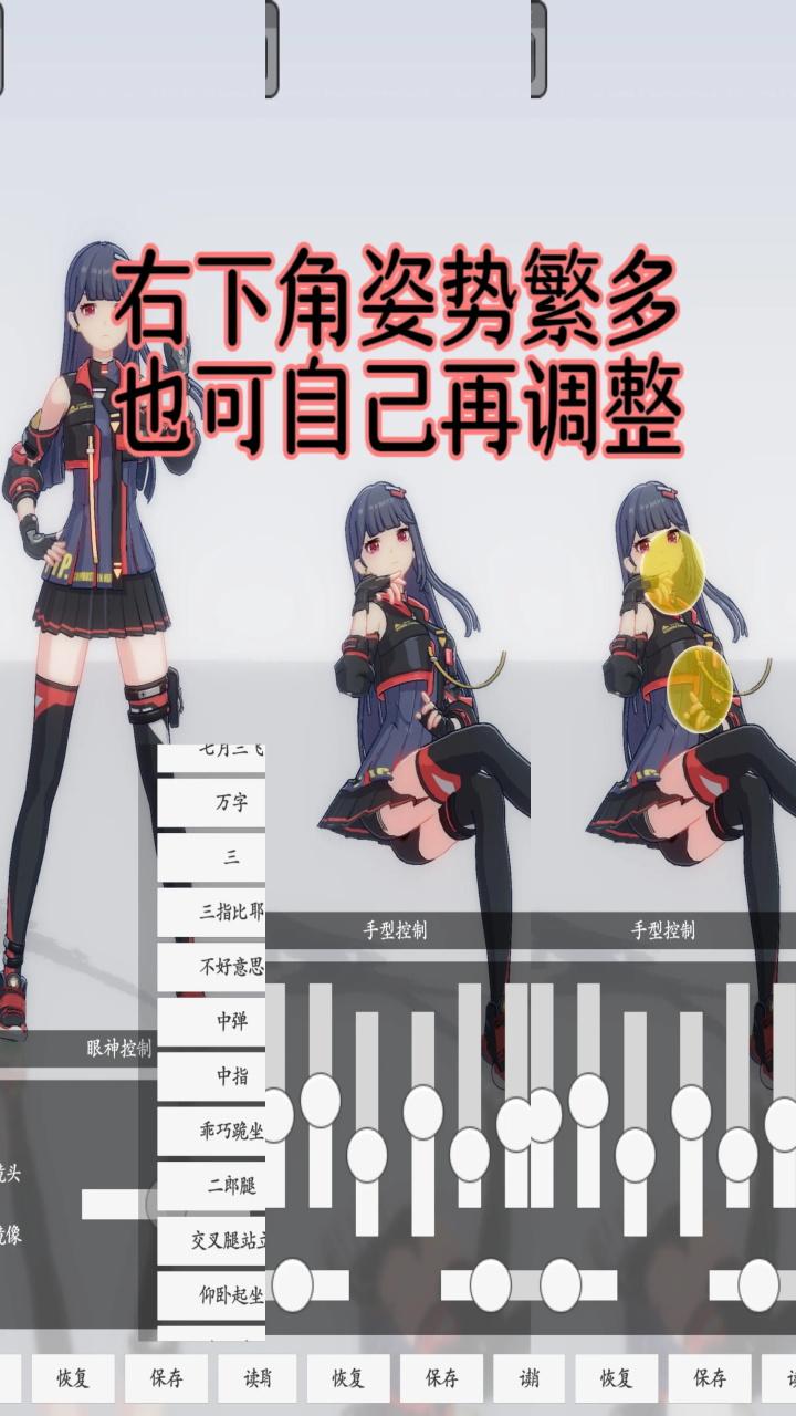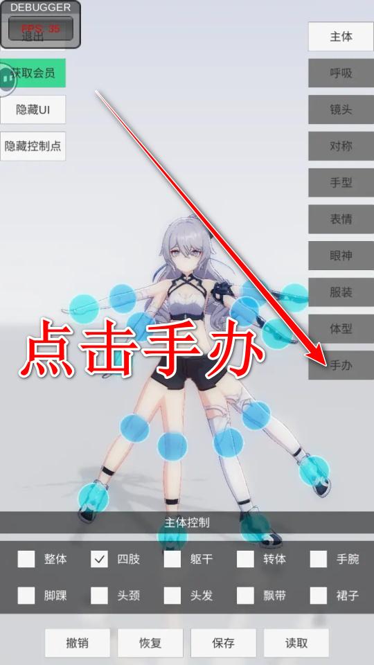1.主体调整上,可调整整体、四肢、躯干、转动(胸/胯)、手掌、脚掌、头部、头发、飘带(衣服上)、裙角。