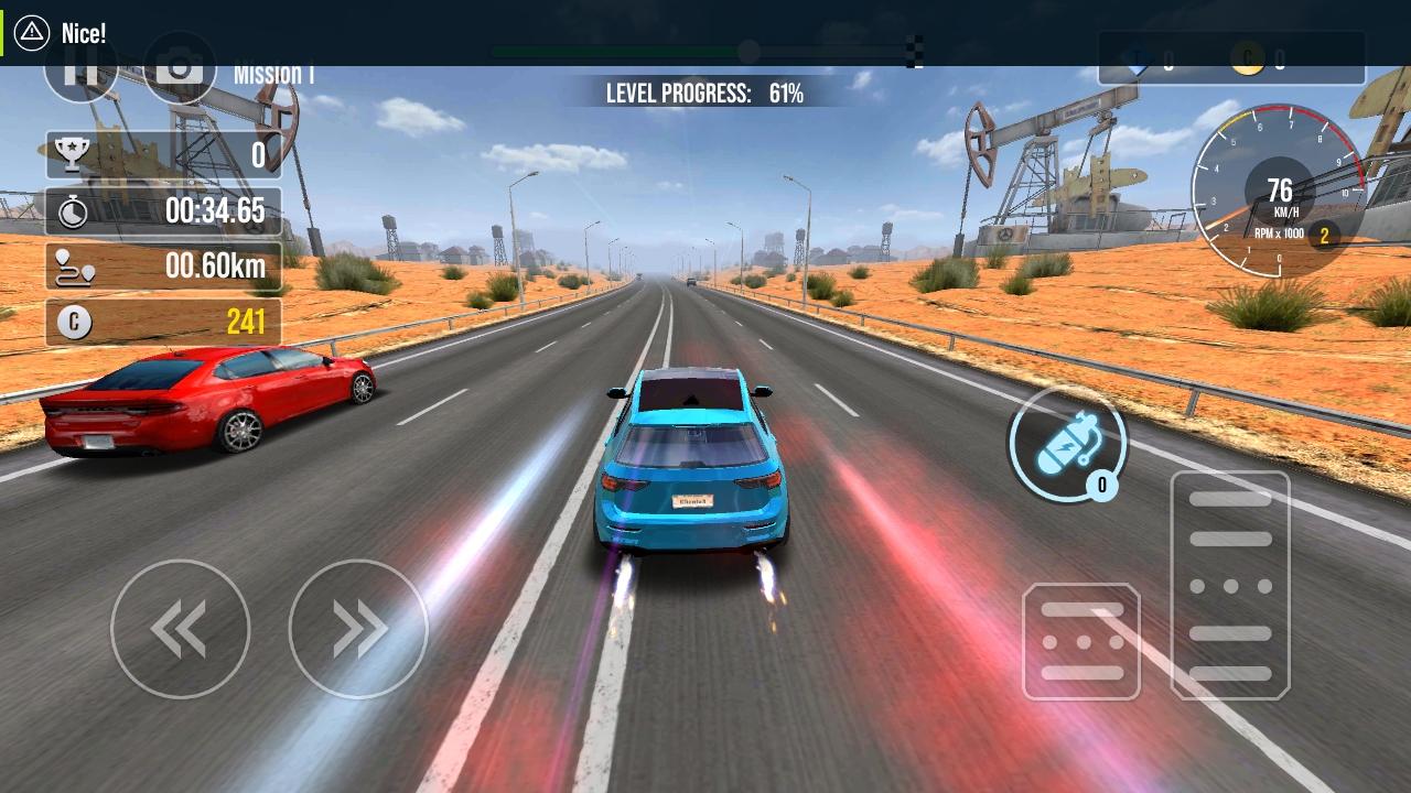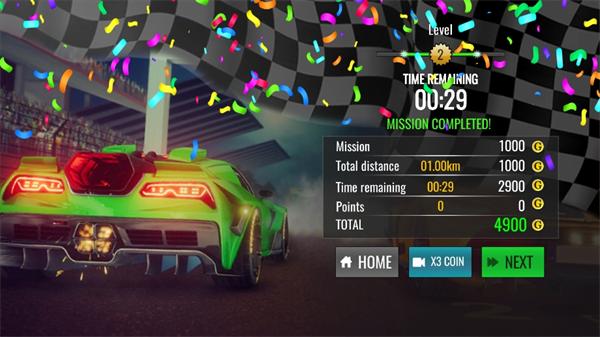 6.在闯关的过程中玩家还需要注意躲避其他车辆,到达终点完成比赛,还能领取到丰富的金币奖励,使用金币可以去解锁更多新的汽车。