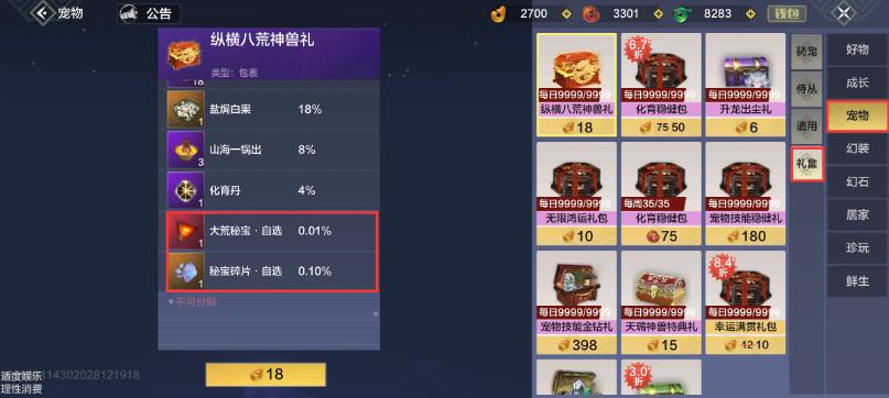 (1)神兽礼包:【商店-宠物-礼盒】可使用婴玉购买神兽礼包,有极小概率获得神兽元胎。