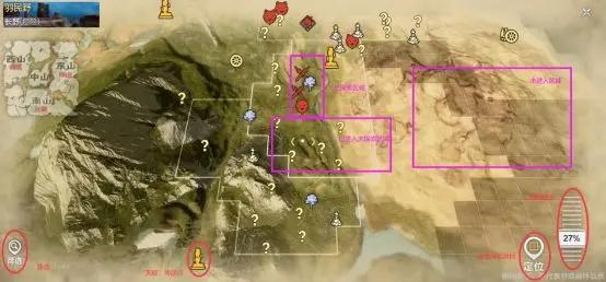 点击游戏界面最左上角打开地图,右下角缩放选项拖动即可调整地图比例,定位选项可以设定导航目的地。地图中当前尚未进入的区域不显示细节,已进入未探索的区域地图上会显示问号,问号经探索后会出现对性的图标,具体图标介绍还请移步主攻略部分查看。