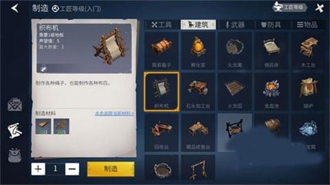 四、木工台、织布机、熔炉是我们用于加工木材(加工成木板)、植物(加工成布匹)、矿物(加工成金属锭)的机器。这些半成品可以用于制作武器、防具也是其他功能建筑升级的材料。建议在素材充足的情况下建造。