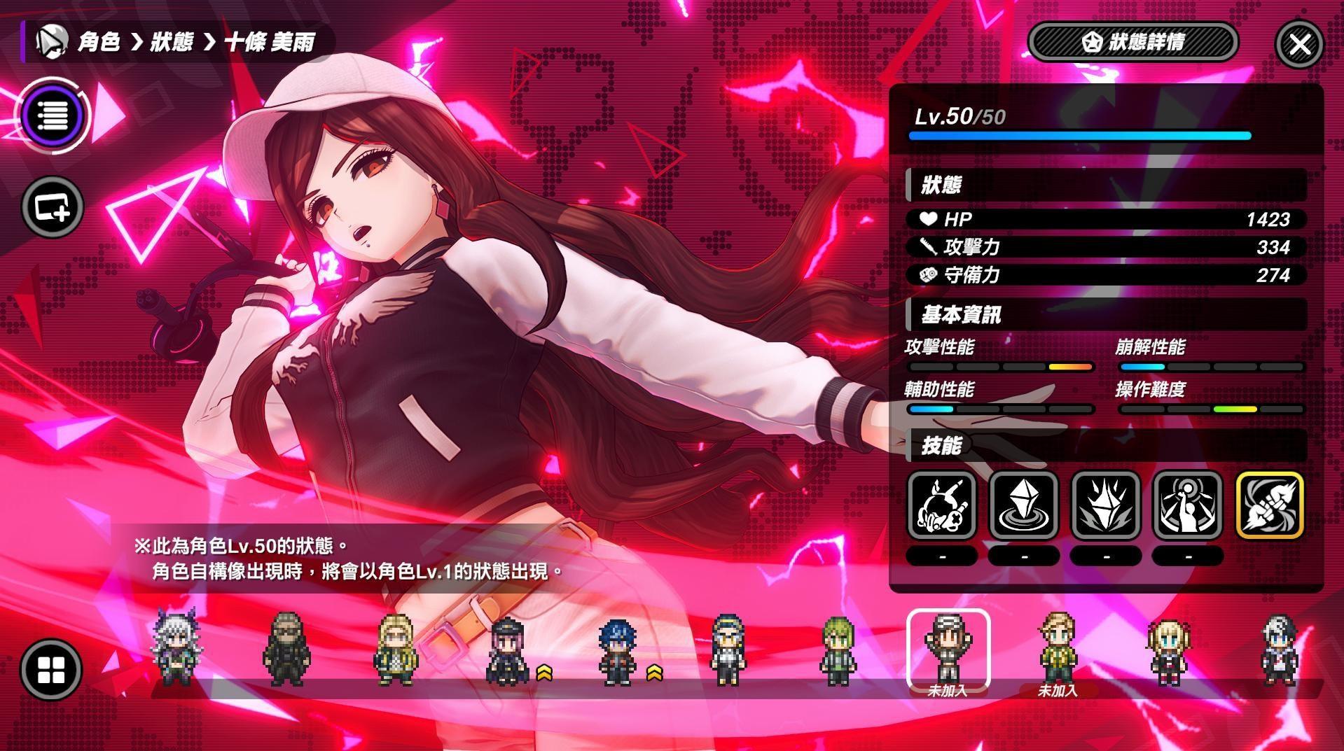 十条美雨:能进行远程改击且搭配能定点持续范围攻击水晶(长按可指定位置放),水晶还能当成分散怪物攻击目标的装置,共鸣叠到120层和终极技引爆水晶时水晶消失。终极技在引爆水晶的同时让拘束敌人,且会依照共鸣层数增伤,如果没水晶直接用则视为身边且1层共鸣判定引爆。十条美雨伤害倍率很高,加上有水晶辅助攻击,伤害相当可观。
