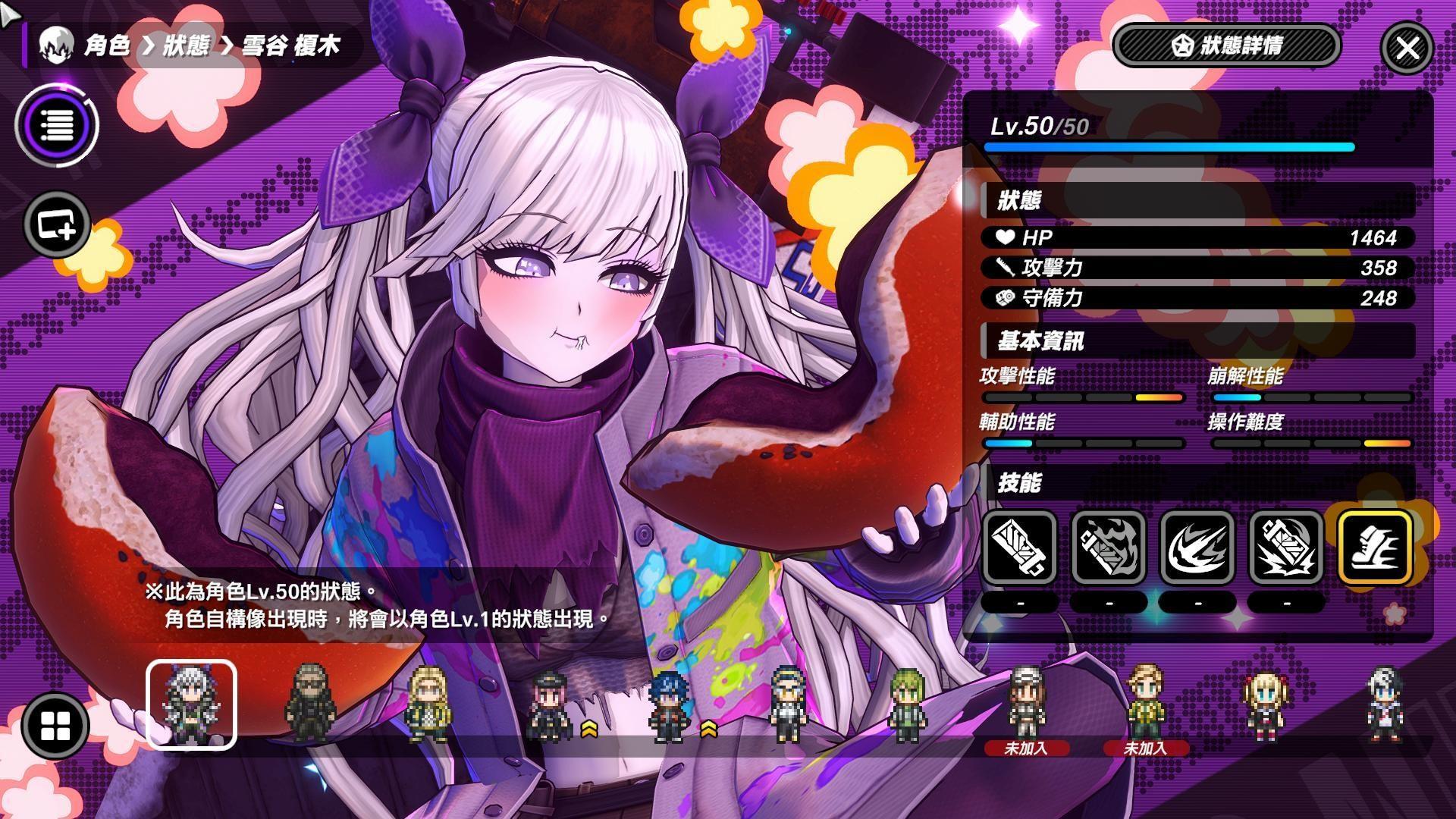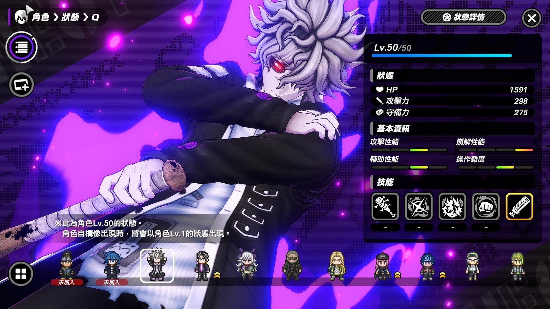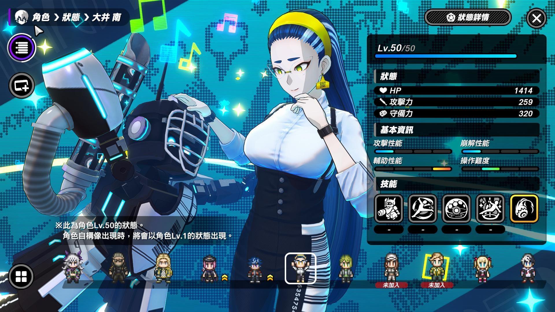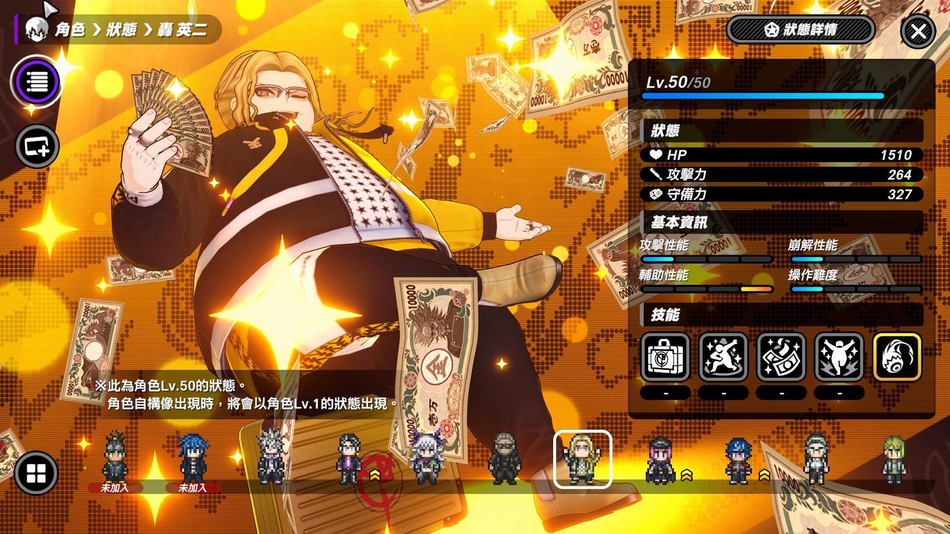 轰英二:和Q一样都可以嘲讽敌人,只是轰英二比较偏向辅助坦,只是坦法有点不太一样,是放战术技能范围攻击後产生范围结界,且持续期间轰英二不能移动和攻击,否则会打断状态,进结界的敌人会被嘲讽。不过这状态有可能被敌人打断且BOSS有时候会不受嘲讽,好在这招没有CD,打断能再补放。结界里我方暴击率提高,并且能让其中的我方造成伤害时,累积愉悦层数,轰英二会依照愉悦层数减少他的终极技能的Tension计量表消耗量,提高放终极技能的频率,终极技能buff全体主要和次要攻击倍率。轰英二拥有很好的辅助能力,再加上是远程的关系,可以看情况开嘲讽让敌人转向走过来,之後看情况取消,有点距离和队友在附近反而会更好发挥。