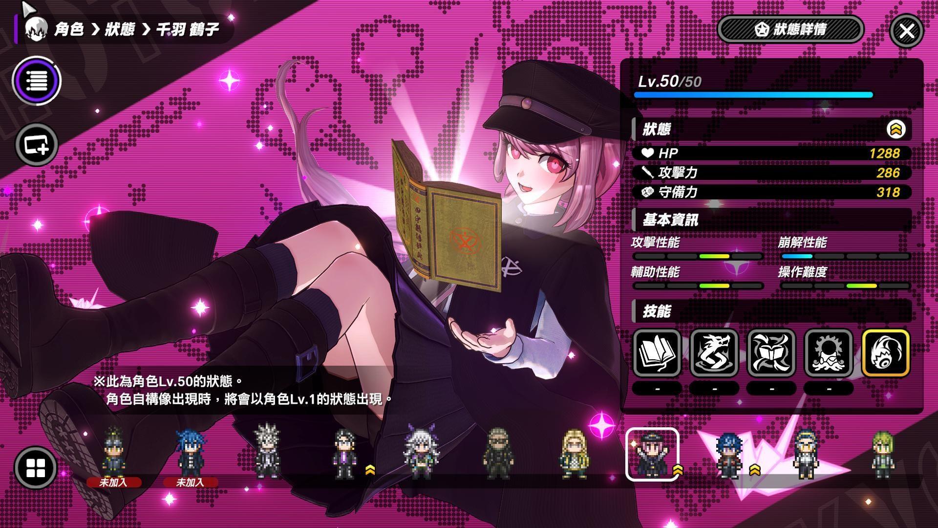 千羽鹤子:限定池,首抽优选,能补能打,有多种恢复手段且能同时攻击加恢复,而且是出手相当流畅的远程攻击。透过反击和主次攻击命中敌人可以累积无明长夜,无明长夜条55层以上就可以放战术技能,但推荐集满触发长夜领域再放。长夜领域可以强化战术技能外,在长夜领域内的敌人受到伤害,就会恢复我方在领域内的成员,虽然补量比较少一点,但胜能一直持续补,结界会一直消耗无明长夜,放战术技能也,长夜领域会在无明长夜归零後消失。终结技则可以攻击所有敌人且附加队伍成员回天,效果是在其hp降至50%以下时,消耗回天拉回血量50%上,只要队友不死都能拉回一点到安全血线。