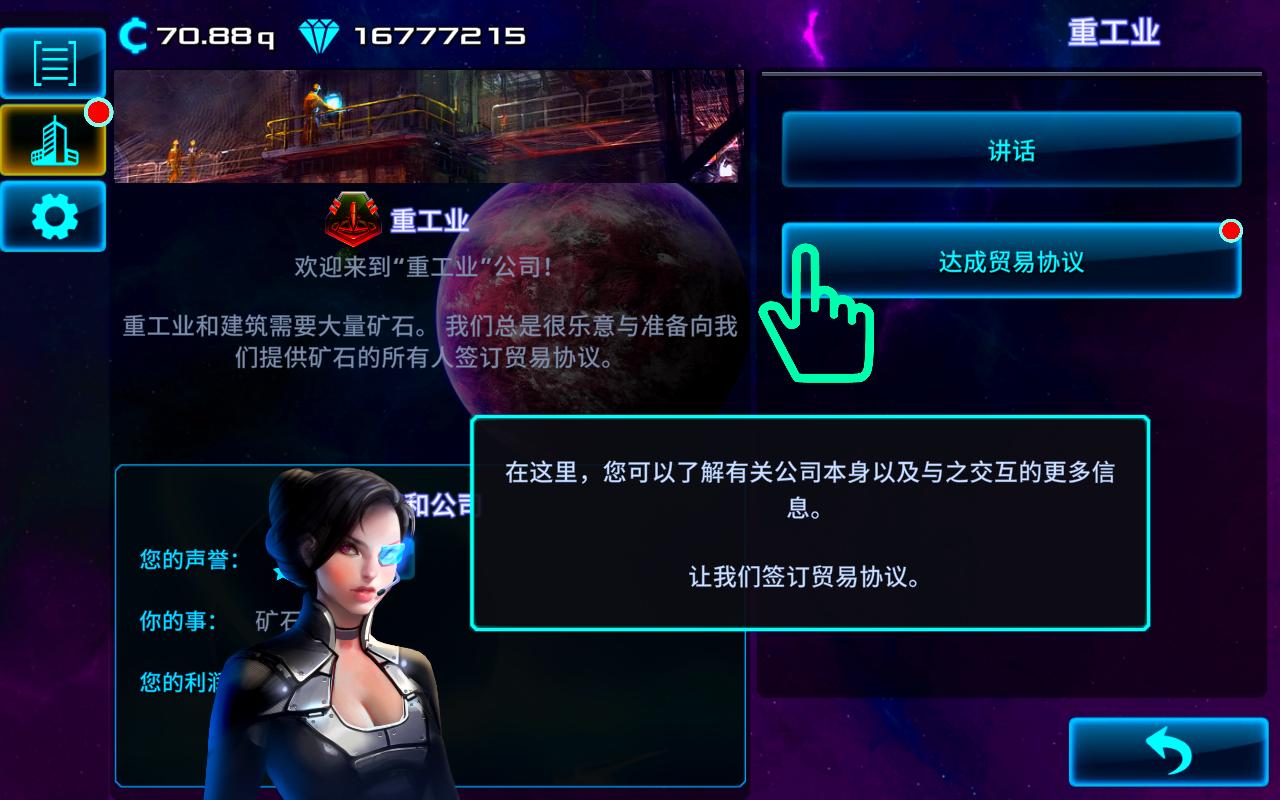太空业务大亨无限钻石版将我们带到太空中做生意,在这里你可以体会到未来世界中的发达科技和接触到各种高科技的元素,超多的经营元素和太空进行结合让游戏充满了科幻感,你需要运用自己的经商能力将你的商业帝国在宇宙中发展壮大。