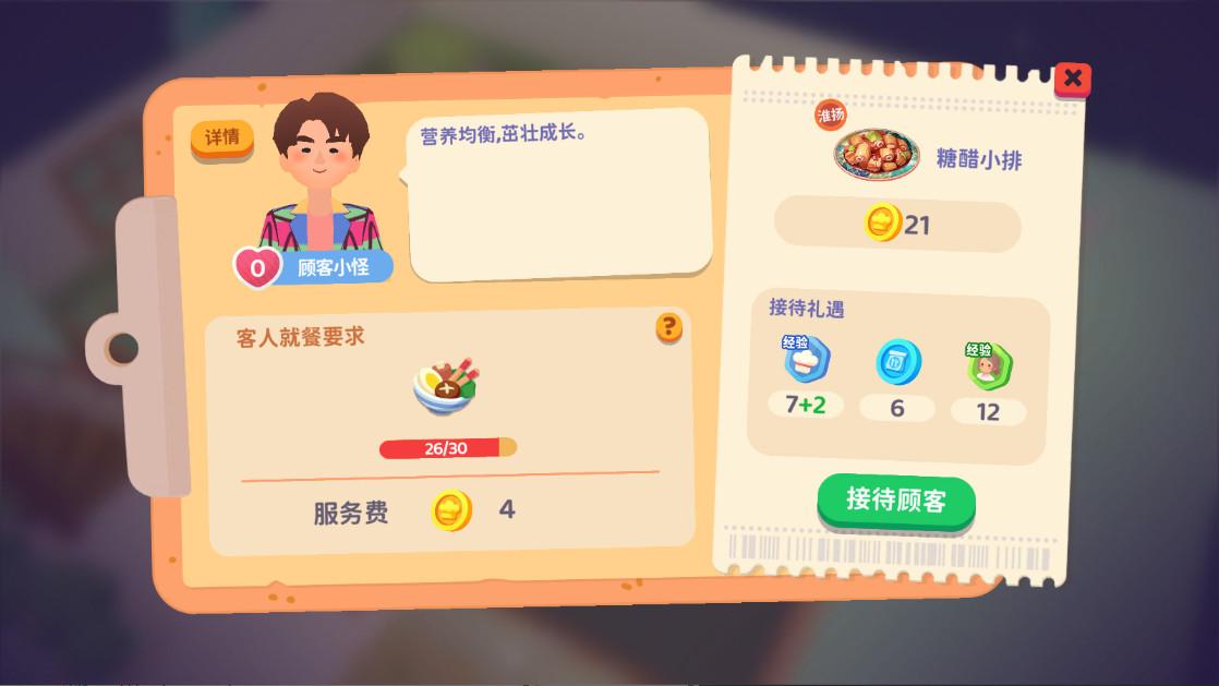 说到经营餐厅,那自然离不开招待顾客了,前期需要多多积累店铺口碑,所以最好是亲力亲为,亲自照顾客人。操作当然也很简单,只需要以下四个操作就可以成功招待客人了:
