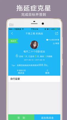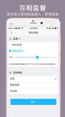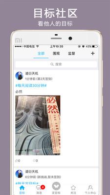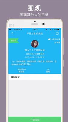 发起目标:发起一个目标,并缴纳一定的押金,邀请你的好友来监督你,达目标的其他用户也会加入对你目标的关注和监督。成功则返回押金,失败则押金分给围观者。