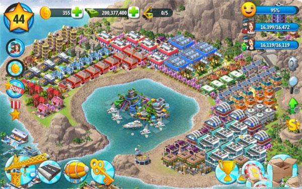 4.有时间时多建造耗时短,升级快的建筑,没时间多建造时间长利润高的,我用金钥匙兑换了一个巨坑5×5水上乐园,占地方,利润少,当然也有多的;