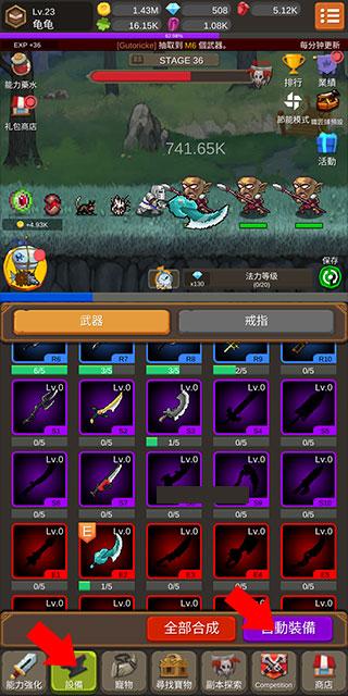 4.抽取到的装备可以点击【设备】按钮并点击自动装备即可为英雄自动穿戴当前最强大的装备,宠物同理