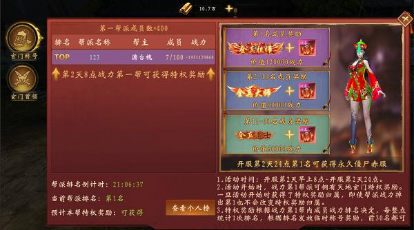 活动开启时,战力第一的帮派可永久获得天地玄门特权(即使活动期间战力掉出第一特权依然存在)特权帮派成员上限+400