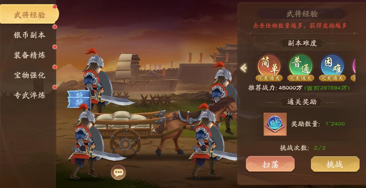 ✦日常副本分为武将经验副本、银币副本、装备精炼副本、宝物强化副本、专武淬炼副本