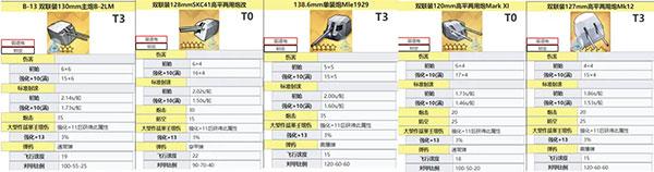 双联B13(左一),通常弹,极佳的轻甲补正,输出距离远,命中好。唯一缺点就是这门炮是北联活动限定,目前只有3门。