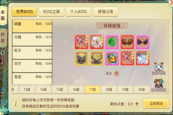 世界BOSS除和平一层外可以击杀三次,当然如果你的VIP等级越高那么那么可以购买的次数就越多。点击BOSS列表的同等级BOSS进入,世界BOSS主要掉落装备、宠物、翅膀幻化、神魔头盔、仙源玉、棋台椅、棋台桌还有套装石和完美套装石,建议大家开和平进入,或者组队争取拿到归属,组队时可人均拿到一份珍惜奖励的。
