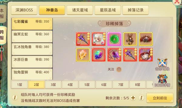 神兽岛属于跨服BOSS,上线优先刷神兽岛,因为神兽岛在跨服还是有很多人抢的。主要掉落装备、宠物、化身、化身石、神魔项链、仙源玉、及第登、及第桌还有套装石和完美套装石,推荐和队友组队刷,或者在设置勾选自动复活。神兽岛的次数较多,一共5次,同样的VIP等级越高可购买的次数就越高。