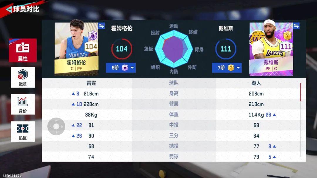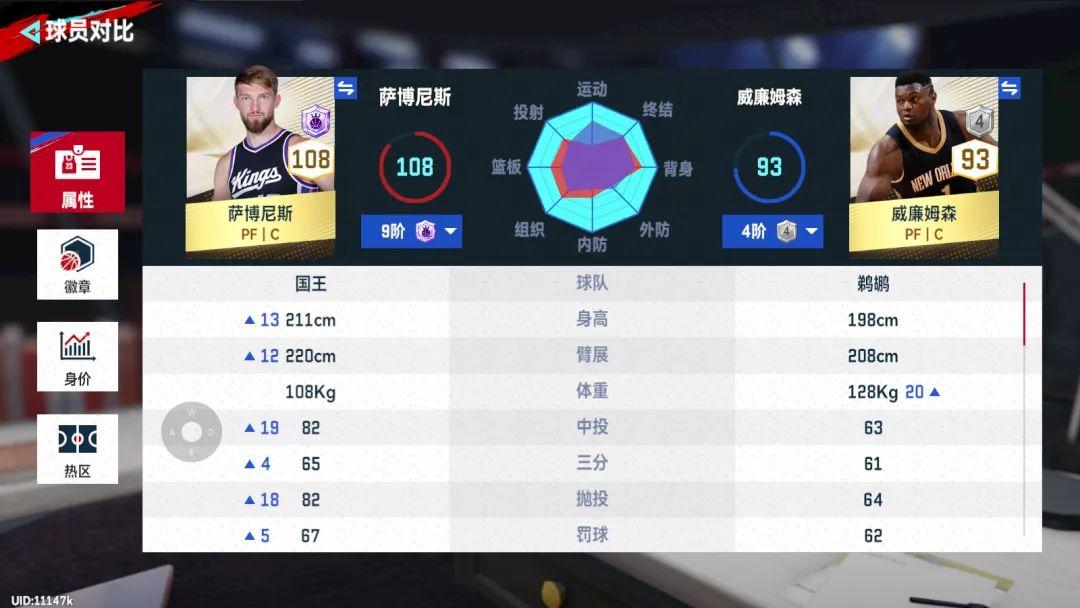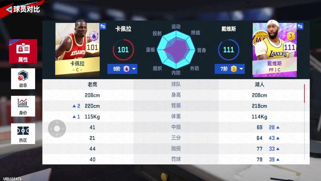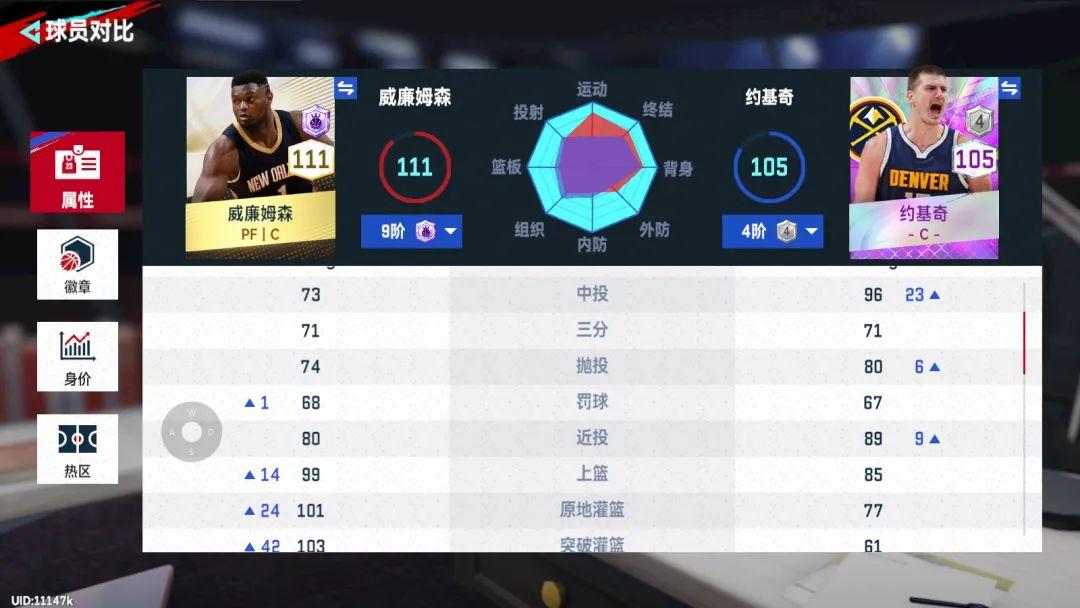 小编也在这里分析下为什么选这两个球员,首先如果一个球队里面小前锋和大前锋需要用金卡,那么说明队伍里有一个紫卡中锋和紫卡后卫,那其实锋线球员就需要更均衡的数值,而这两个球员也是在众多金卡锋线球员里数值较全面的。