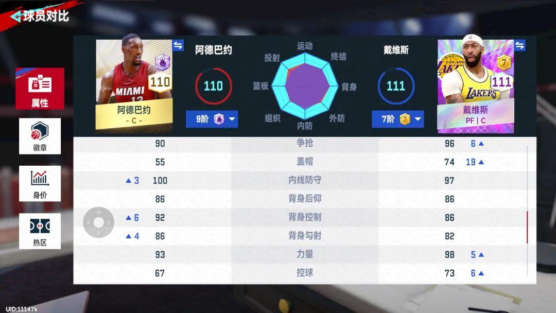 然后是阿德巴约,阿德巴约属于各方面都比较均衡,像禁区终结,中投都不错。而阿德巴约还有一个特点,就是硬!这里指的不仅是肌肉硬,可以看到阿德巴约的内线指数都特别高,内线防守,内线背身以及力量,所以遇到一般的中锋,阿德巴约完全可以背打进去完成终结。