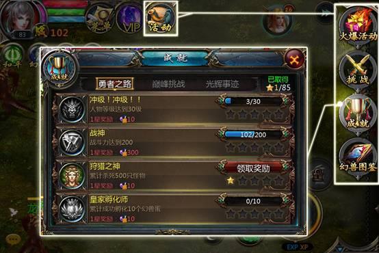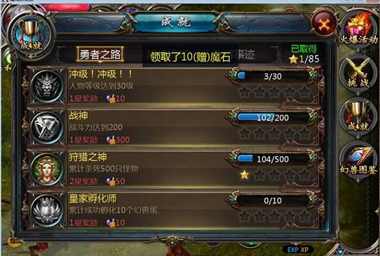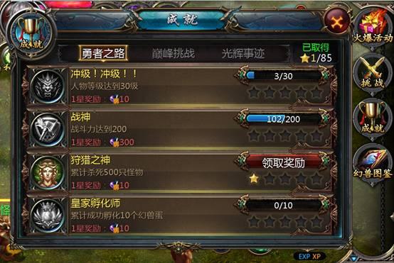 “勇者之路”的成就达成难度较低,比如之前提到的“狩猎之神”就是“勇者之路”分支下的成就之一。“勇者之路”下的每个成就都分为五个阶段,每完成1个阶段,该成就就点亮1星,同时进度条也会变成领取奖励按钮,点击它可以使你获得成就中所描述的该星成就奖励:比如图中的狩猎之神1星奖励就是10点绑定魔石。