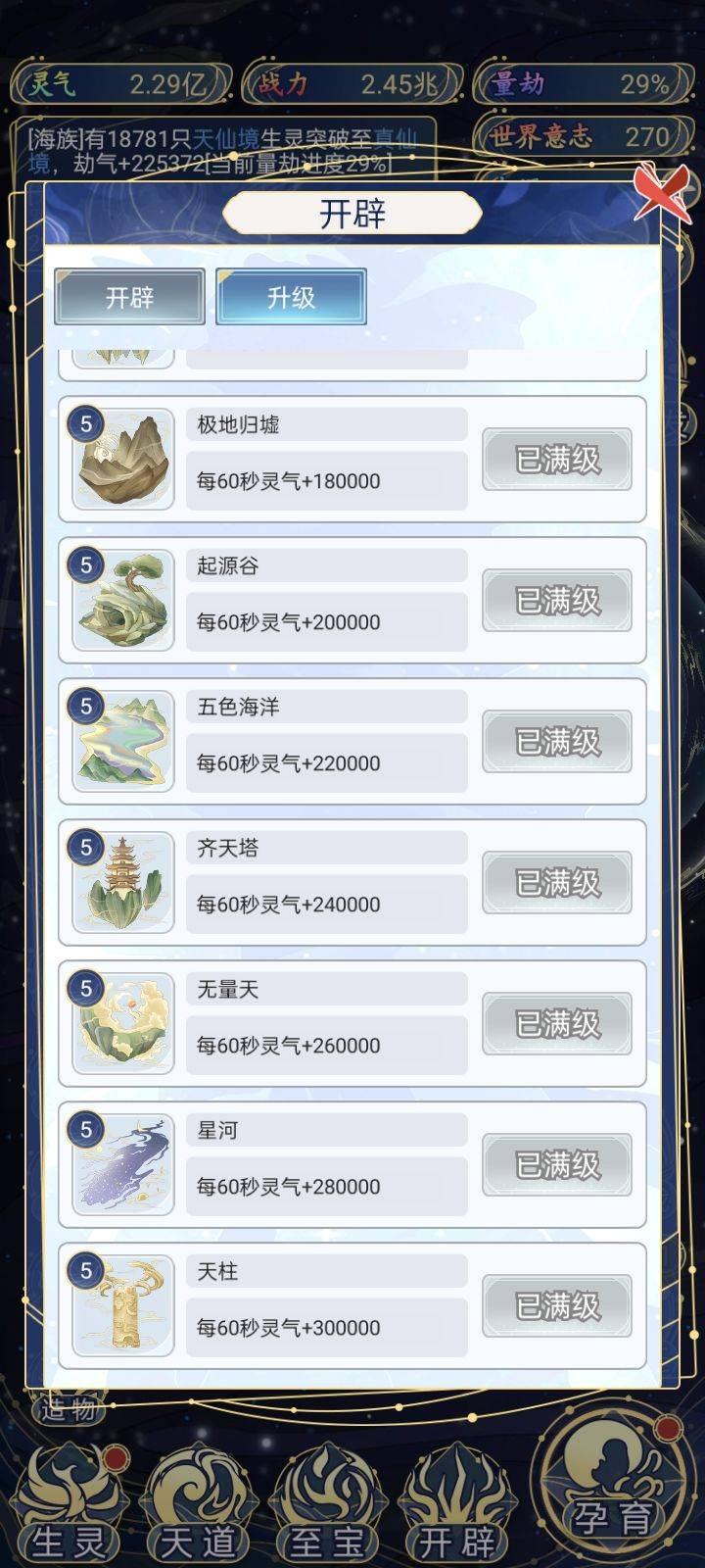 每当我们的世界到一定层次,能够开辟的上限就会增加,建议先点加灵气的,快速抽卡累积战力