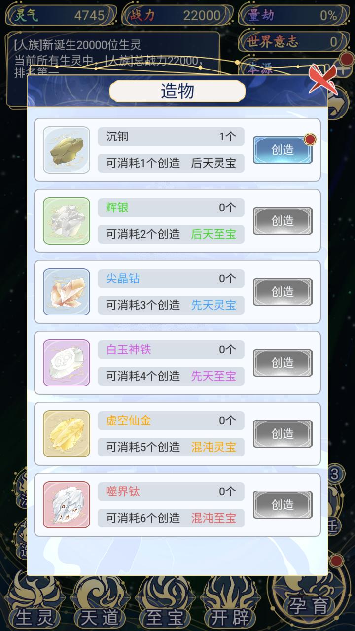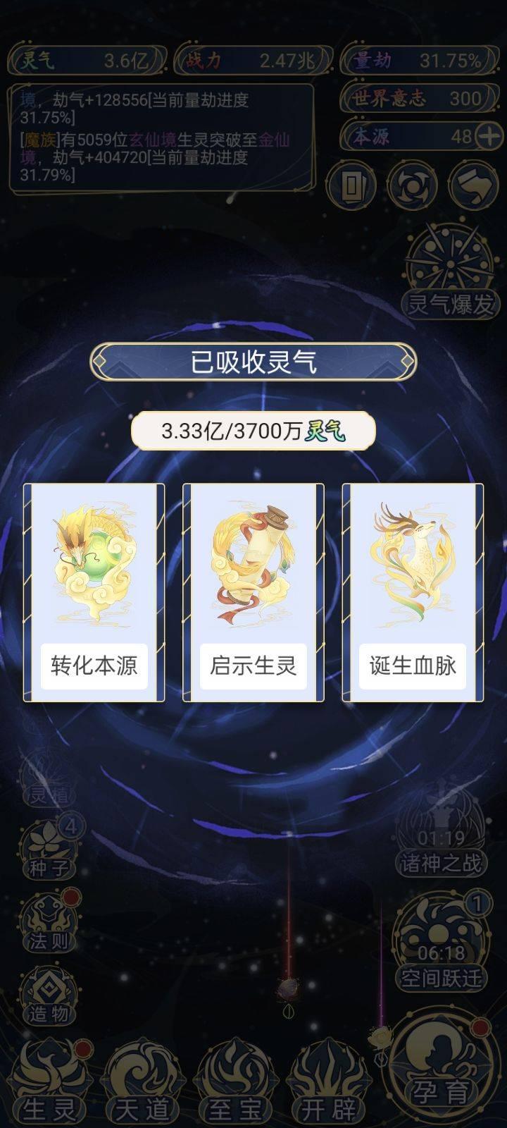 天道创造一款让你实现当造物主的梦想,开局选择一个地点然后选择诞生的生灵通过升级世界投放灵植来提升世界法则来吞噬其他界面,可以自己的世界里控制不同种族数量,但一旦生灵超过了世界的容乃量就会出现特殊事件比如人族和兽族爆发战争我作为天道可以偏袒一方,可以降下机缘给人族让人族战力提高但是却不能保证其百分百取胜。经常出现我偏袒人族但最后取胜的是另一方,都不明白是怎么回事?难道是兽族生命力顽强吗?还可以通过投放各种修炼资源或者通过提升世界的灵气的等级来诞生修炼圣地提升各个种族的修炼速度和境界。我觉得人族是最容易出现高境界的(就是明明最高境界的是真仙境结果就有突破至大帝境,真就和仙侠小说一样各种机遇所以我贼喜欢培养人族),兽族生命力最顽强,虫族繁殖力很强,羽族的话比较平均没啥特点,以上是我玩的时候个人给我的感觉,后面的种族我也还没解锁到。