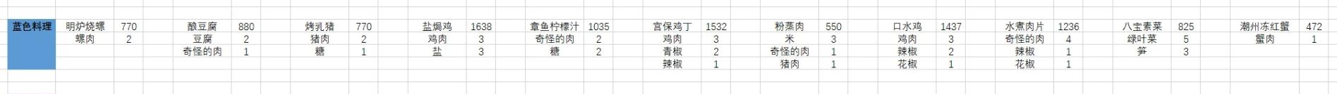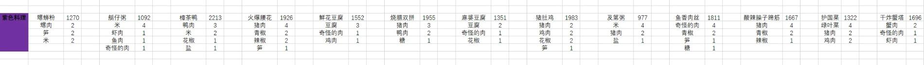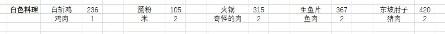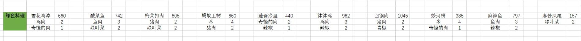 35.【艇子粥】:米×4虾肉×1鱼肉×1奇怪的肉×136.【樟茶鸭】:猪肉×2鸭肉×2花椒×2笋×1